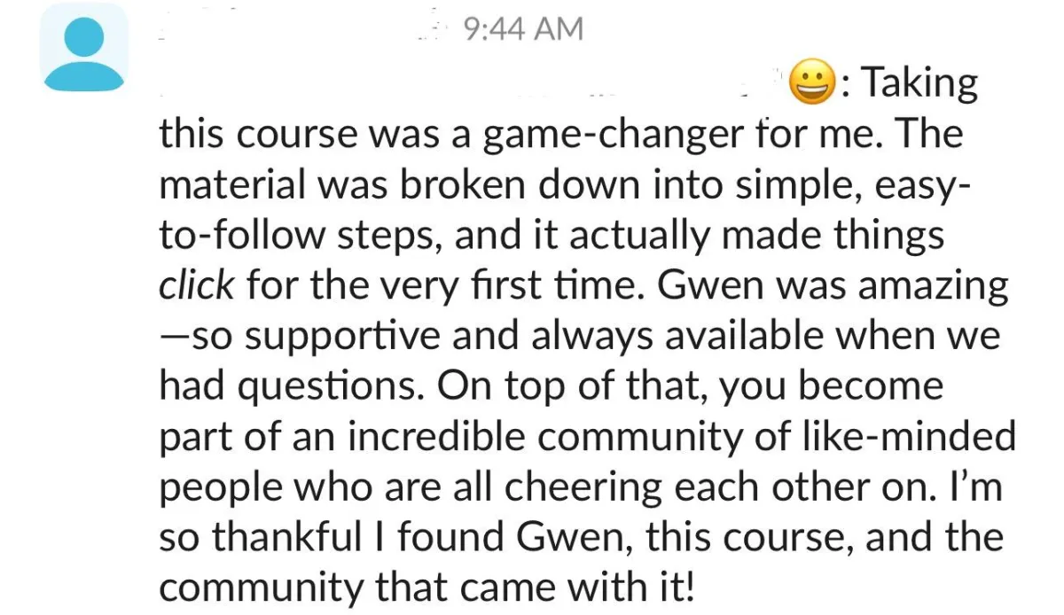 Members will have access to the community where they can ask questions and share feedback. I have built out this course to include ALL THE THINGS you need to know, in a step-by-step easy to follow manner. Knowing there will still be questions though, which is why you have access to a private member community to ask questions, share wins and ask for feedback.
